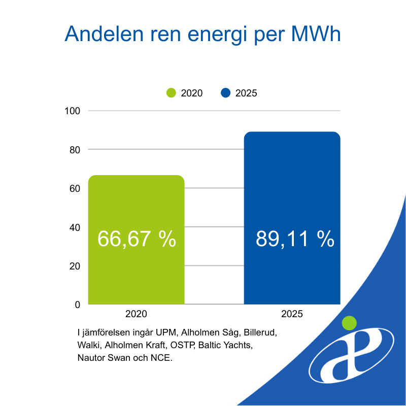 Indikatorn visar andelen ren energi per MWh, men inte industriernas totala energivolymer. I jämförelsen ingår UPM, Alholmen Såg, Billerud, Walki, Alholmens Kraft, OSTP, Baltic Yachts, Nautor Swan och NCE.